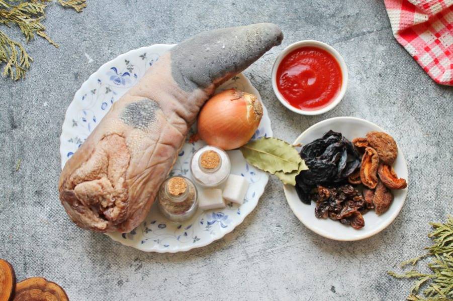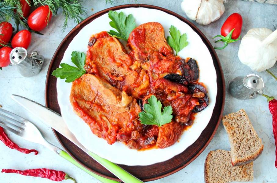 Говяжий язык не зря считается деликатесом, хотя и не очень популярен. Предлагаю приготовить интересное и необычное блюдо с добавлением сухофруктов и томата.