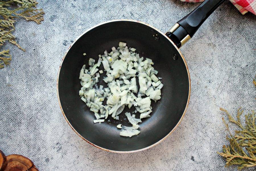 В сковороду налейте растительное масло и разогрейте на среднем огне. Вторую луковицу репчатого лука мелко порежьте и выложите в сковороду.