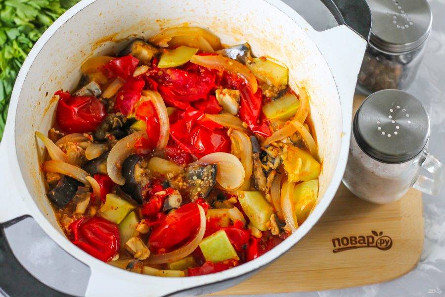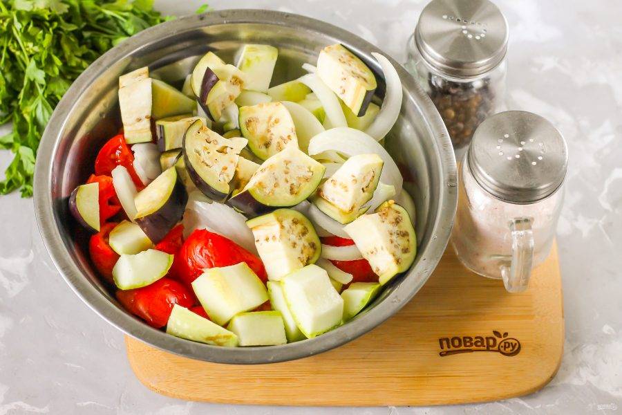 Лук очистите от кожуры, промойте со всеми овощами. С кабачка и баклажана срежьте хвостики. Из помидоров вырежьте зеленые сердцевинки. Нарежьте все овощи крупными ломтиками, а лук - полукольцами.