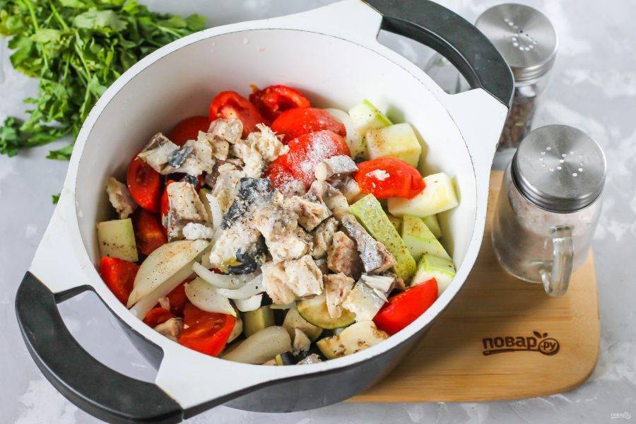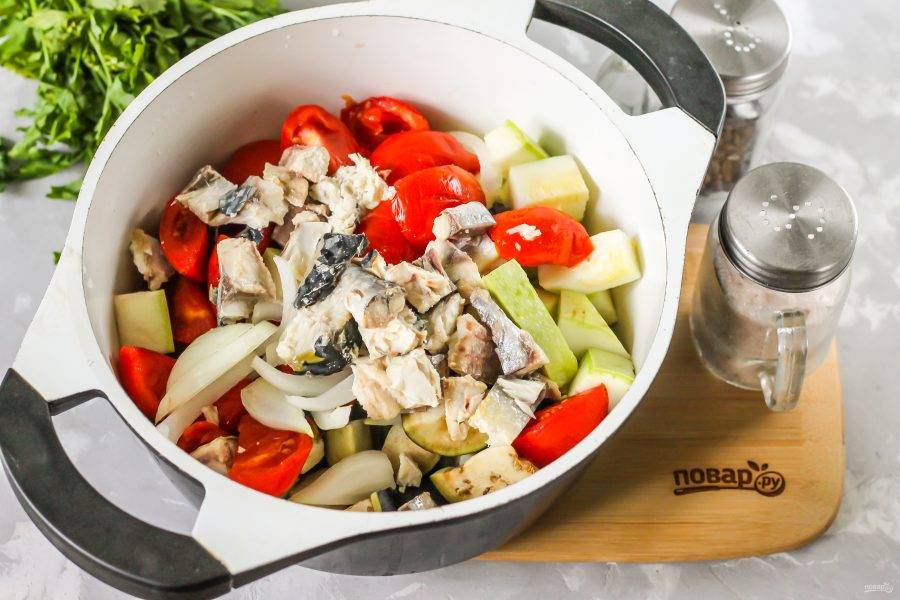 Выложите овощи в казан, сверху добавьте отваренную мякоть скумбрии.