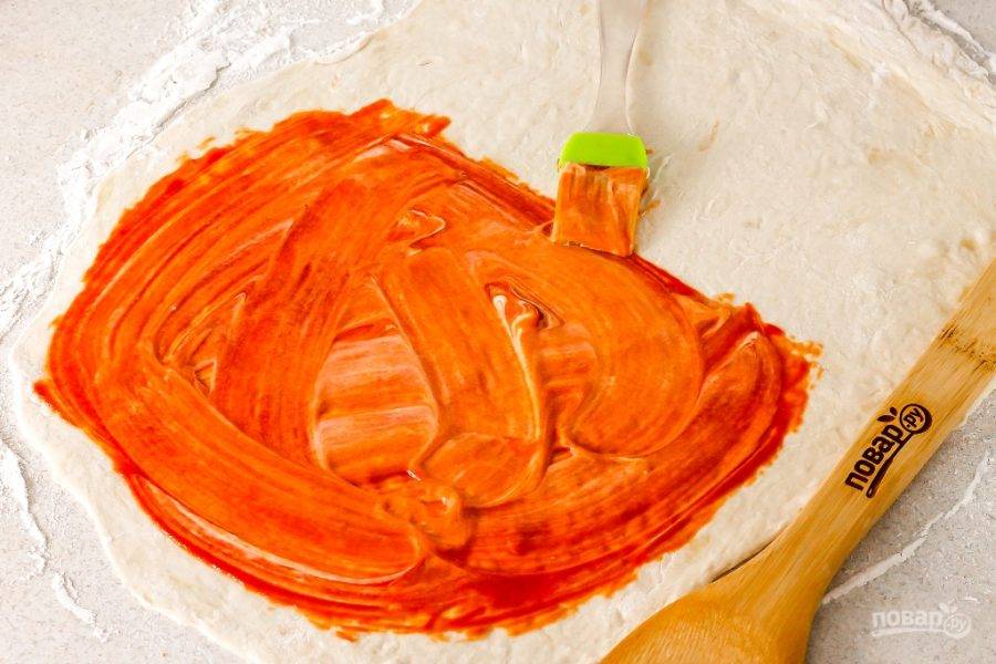 На рабочей поверхности раскатайте дрожжевое тесто в овальный пласт. Это можно сделать сразу же на пергаментной бумаге, смазанной растительным маслом, чтобы потом не переносить пиццу на противень. Соедините кетчуп и майонез, смажьте таким соусом половину теста, оставляя немного места на краях для скрепления обеих частей.