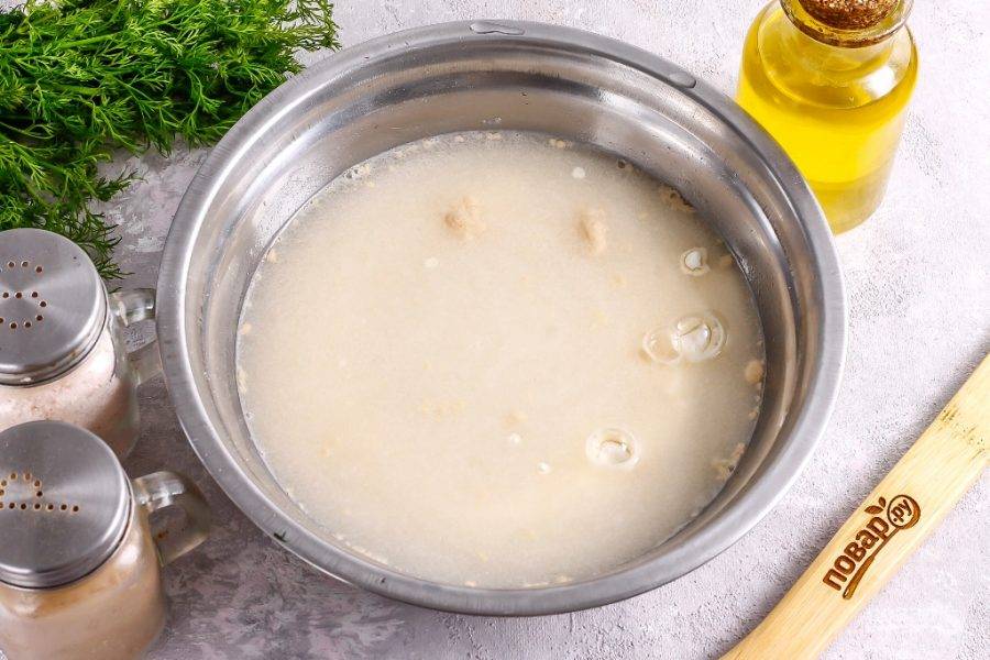 Влейте в глубокую емкость теплую воду, всыпьте треть пшеничной муки, сухие дрожжи, соль. Тщательно размешайте, создавая опару. Накройте емкость полотенцем и поместите на 20 минут в теплое место.