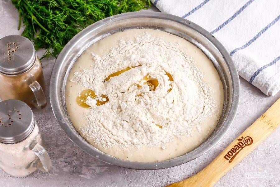 Затем всыпьте в опару остальную муку и влейте растительное масло. Замесите дрожжевое тесто — оно должно быть мягким. Немного муки оставьте на раскатку.