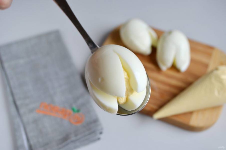 2. Надрежьте каждое яйца острым ножом крестообразно. Главное, чтобы яйцо сохранило форму, не порвалось. Осторожно извлеките желток.