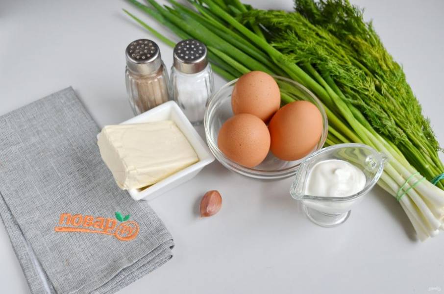 1. Подготовьте продукты. Вымойте зелень. Отварите яйца, остудите и осторожно очистите от скорлупы.