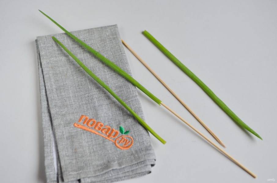 4. Сделайте ножку для цветка: нанижите лук на бамбуковую палочку, на каждый цветочек по одной ножке.