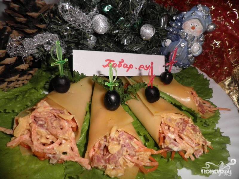 Взять сырные ломтики выложить на них начинку и свернуть рулетиком.Закрепить шпажкой ,украсить маслинами и выложить на листья салата.Вот и всё закуска готова!
