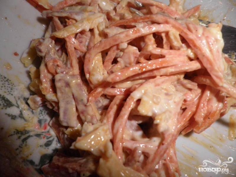 Сыр натереть на крупной тёрке.Колбасу нарезать тонкими полосками.Чеснок измельчить через пресс. Все ингредиенты добавить к морковке, заправить майонезом и перемешать.