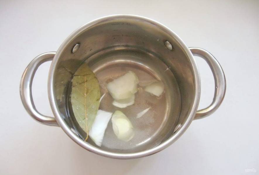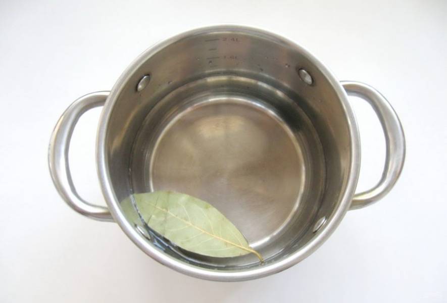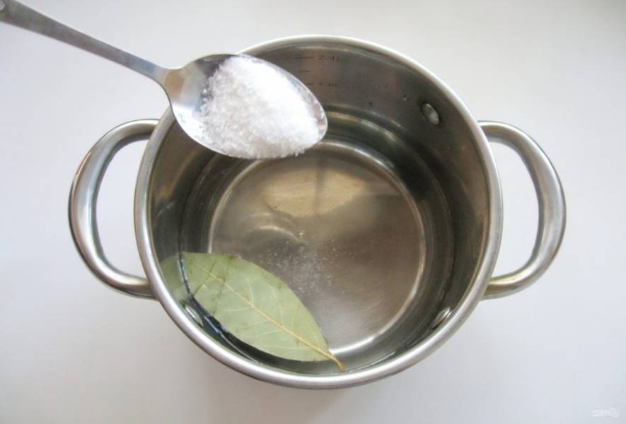 Приготовьте маринад для баклажанов. В кастрюлю налейте воду, добавьте лавровый лист.