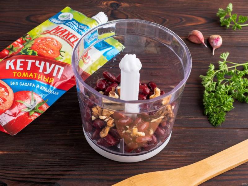 Фасоль и орехи положите в чашу блендера и пробейте.