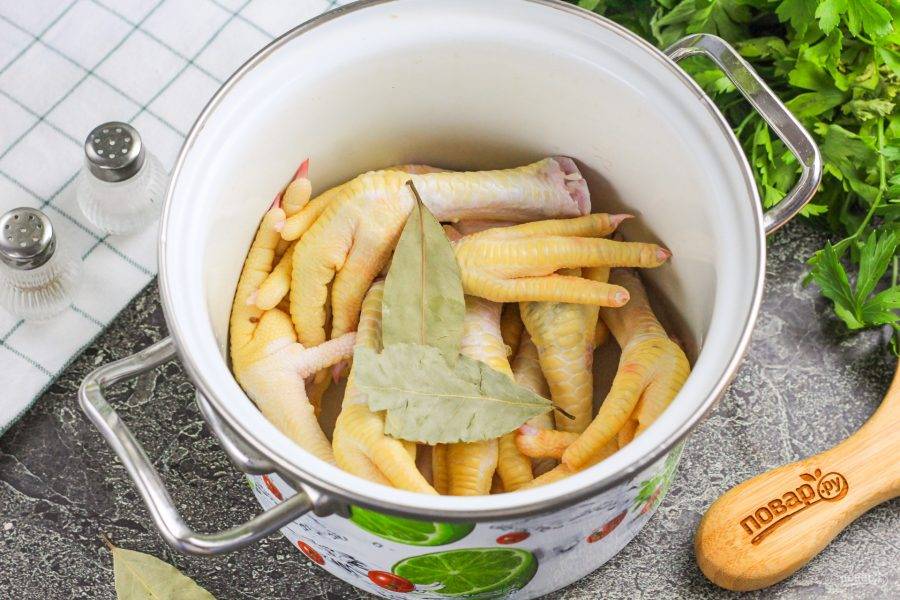 Выложите их в кастрюлю, всыпьте приправу куриную, 2 щепотки соли и лавровые листья. Залейте горячую воду и отварите лапки 20 минут.