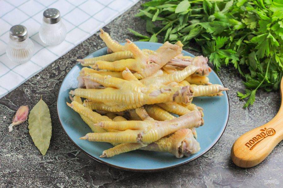 Куриные лапки очистите от желтой кожи, удалите ногти и тщательно промойте в воде.