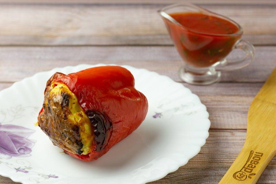 Наши перчики готовы! Подавайте к столу с соусом и свежей зеленью.