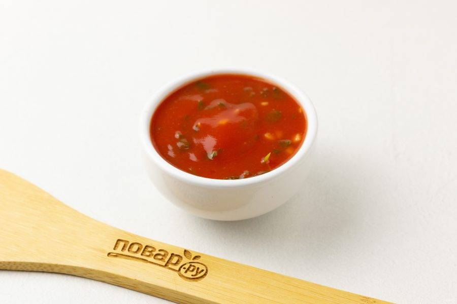 Приготовим соус. Томаты очистите от пленки, разомните и уварите вместе с соком 4-5 минут на сковороде. Затем добавьте рубленый чеснок, зелень, потушите ещё 1-2 минуты и выключите плиту. Накройте соус крышкой, чтобы не остыл.