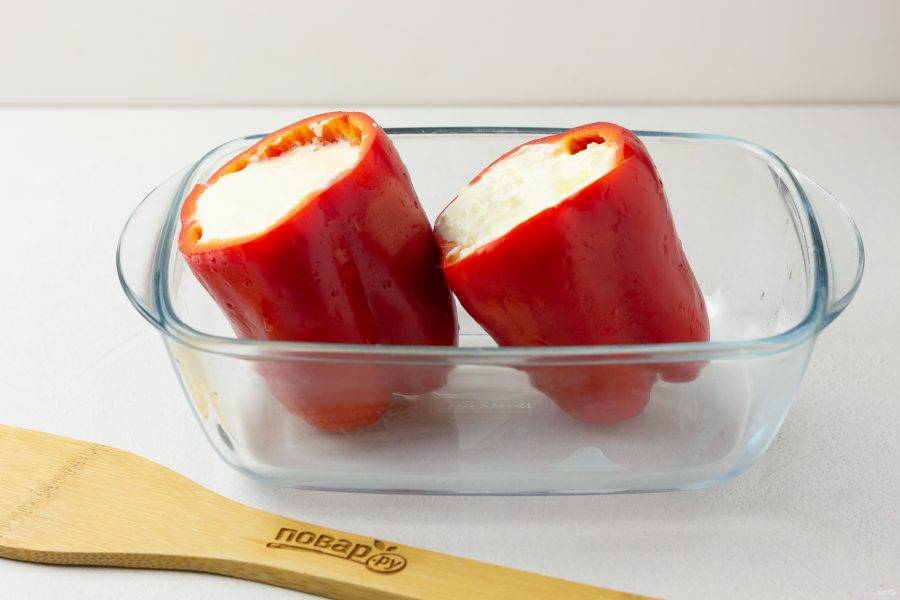 Перцы помойте, очистите и начините подготовленной сырной массой. Поставьте перцы запекаться в форме в духовку на 50 минут при температуре 180 градусов.
