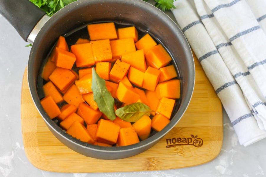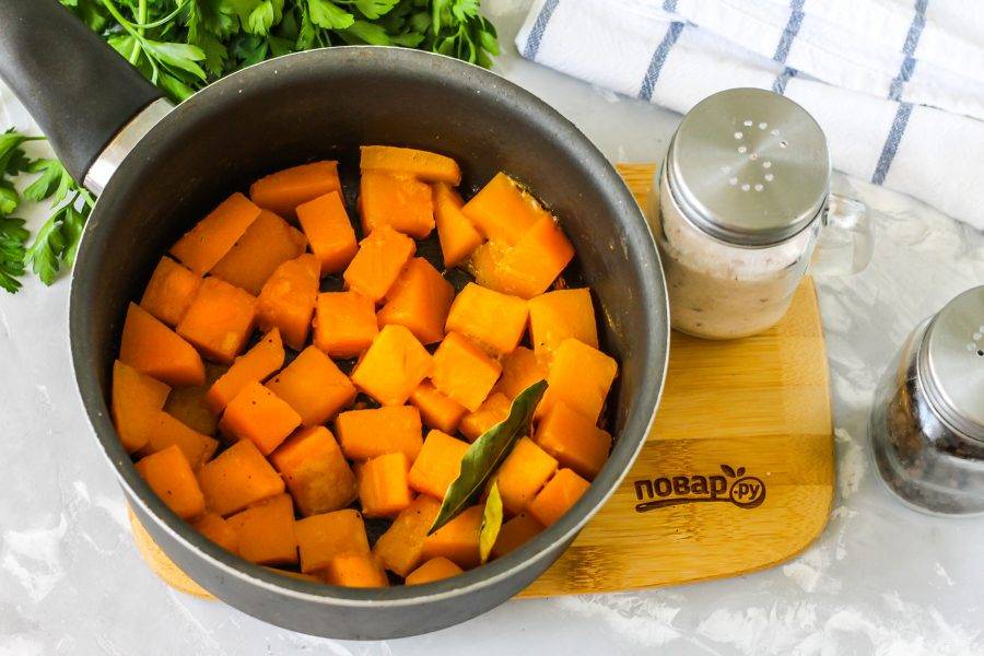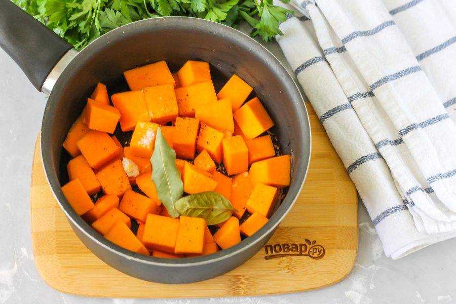 Накройте емкость крышкой и отварите нарезку тыквы примерно 10-12 минут до мягкости.