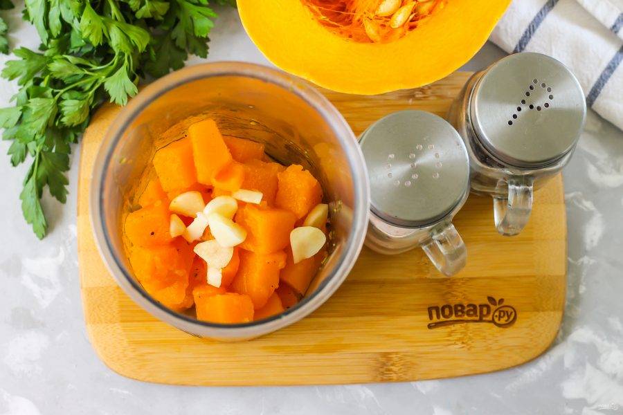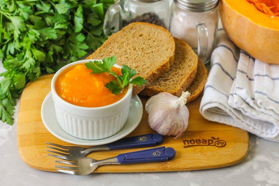 Аппетитная и пикантная закуска из тыквы с чесноком подается с ломтиками хлеба, лепешками, лавашом и т.д. Готовится она за 15-20 минут, но при настаивании в холодильнике становится более ароматной.