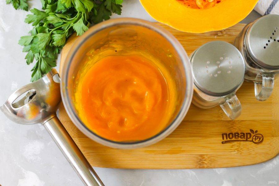 Измельчите все содержимое емкости погружным блендером в течение 2-3 минут. Помните о том, что при остывании закуска загустеет!