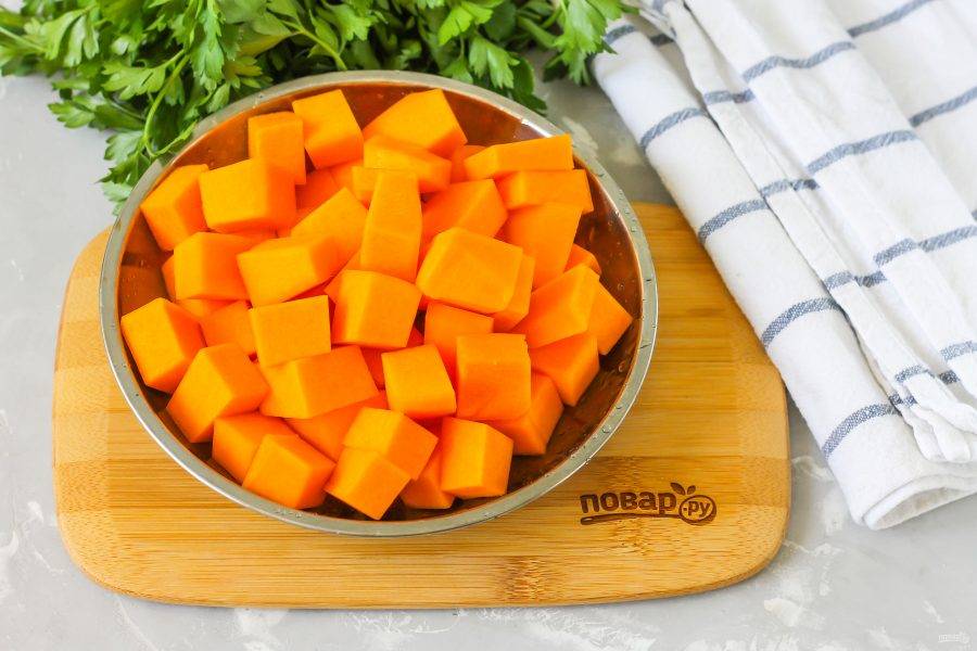 Спелую и ароматную тыкву разрежьте пополам, счистите с нее кожуру и удалите семена внутри. Промойте в воде мякоть и нарежьте порционными кубиками. Чем больше размер нарезки, тем дольше она будет готовиться.