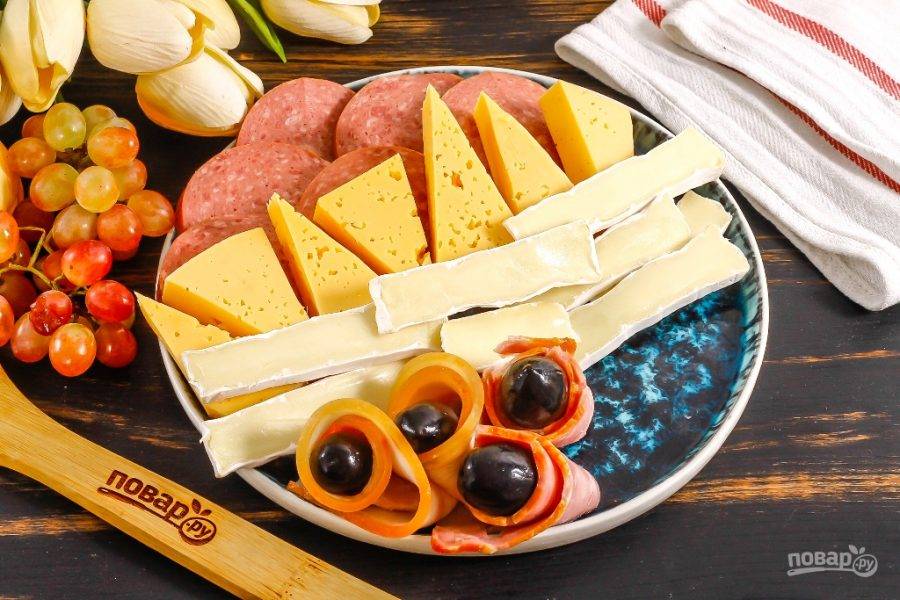 Красочная закуска для вина не оставит равнодушными ваших гостей. В ней вы можете сочетать любые виды колбас и мясных изделий, сыров и фруктов, ягод. Не забывайте про маслины, оливки и различные соусы.
