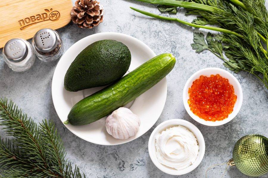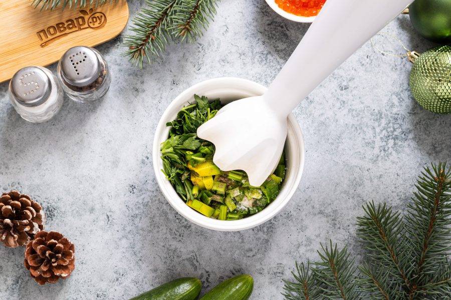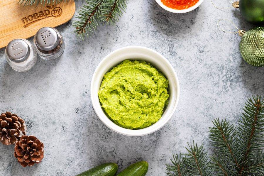 Предлагаю идею овощной закуски, которую можно приготовить на Новый год. Она состоит из огурца и зеленого мусса из авокадо с зеленью, которые выкладываются в форме елки.