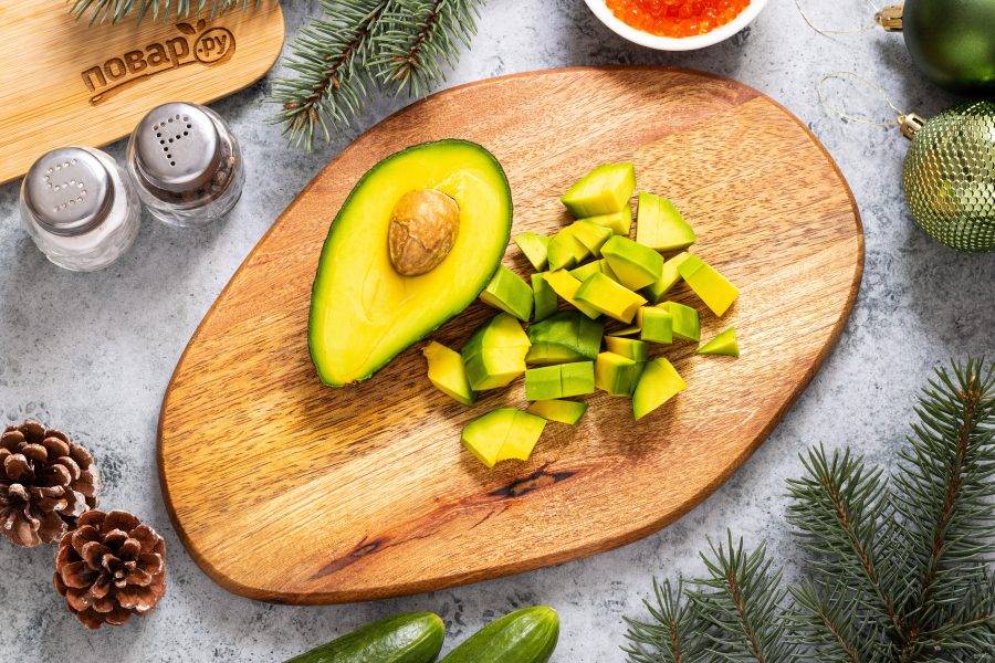 Авокадо очистите от кожуры, удалите косточку. Нарежьте ломтиками.