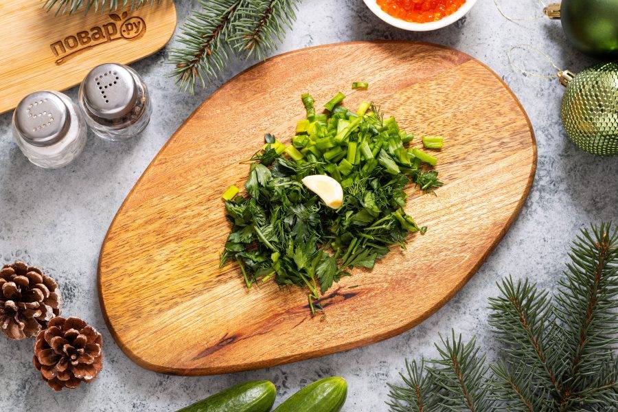 Зелень помойте, мелко порежьте. Чеснок очистите.