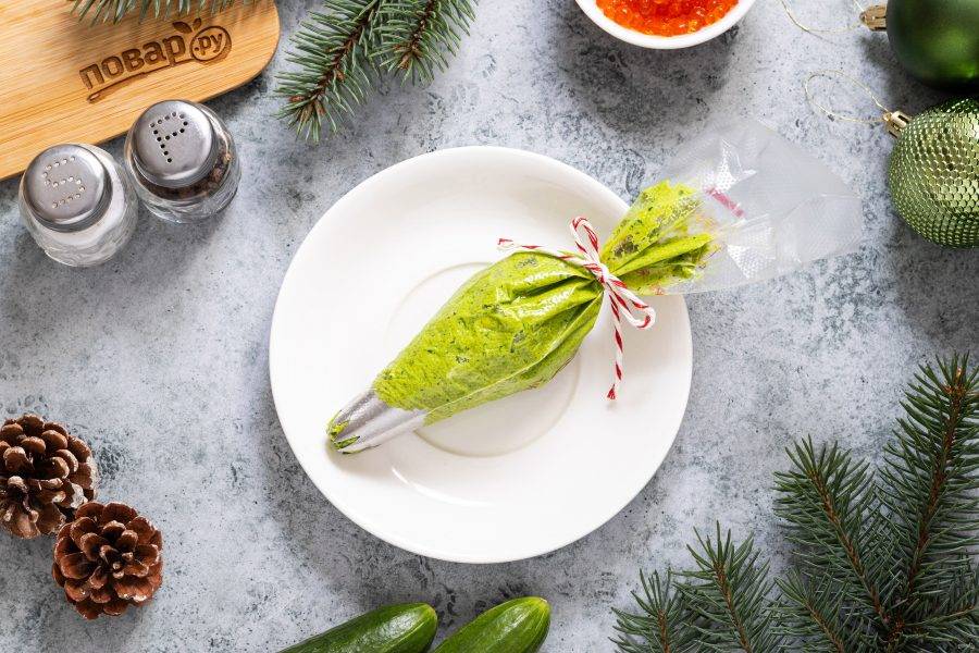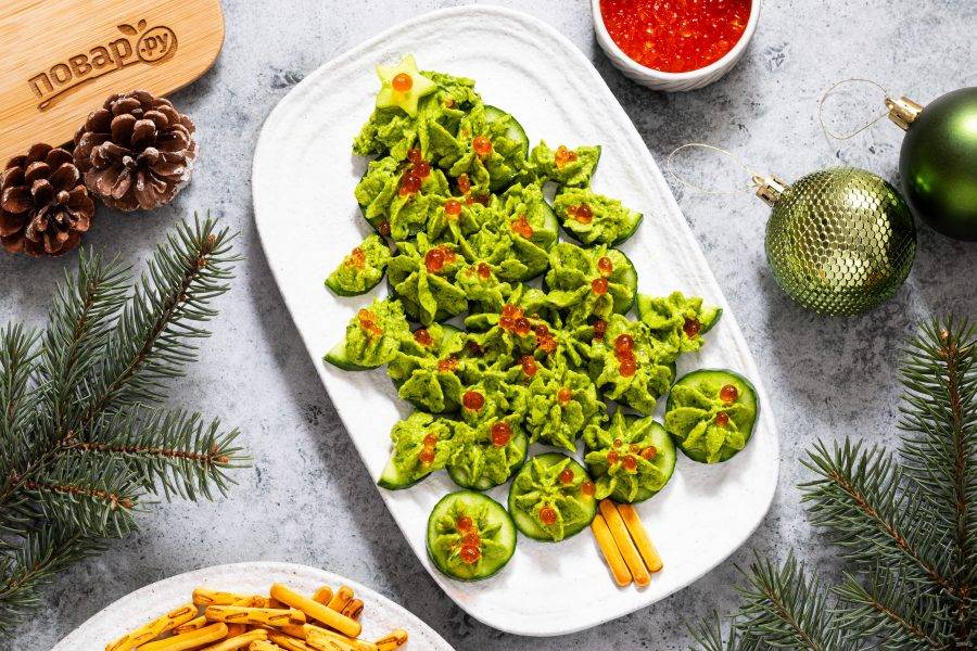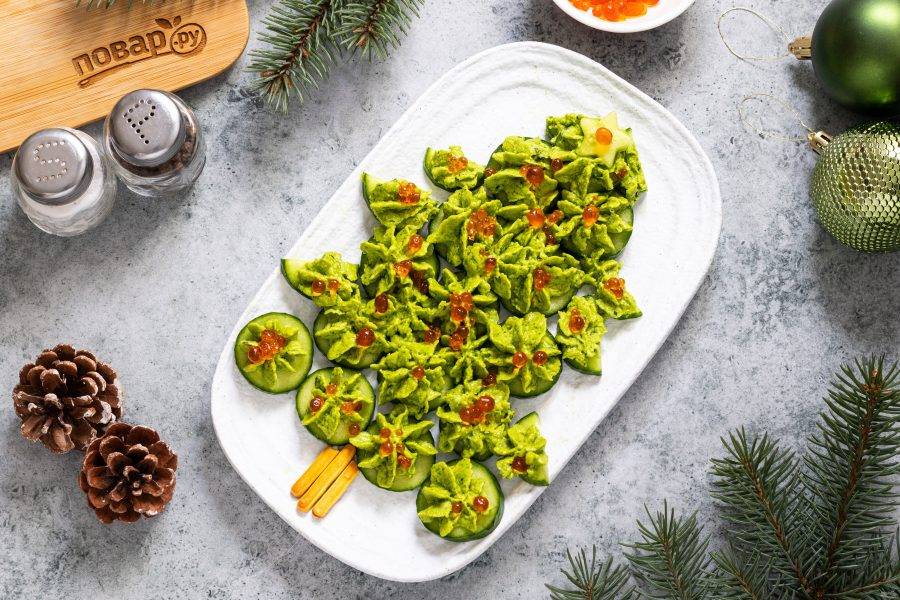Сверху добавьте красную икру. Для декора из соломки сделайте ствол елки, а из одного кружочка огурца вырежьте звезду.