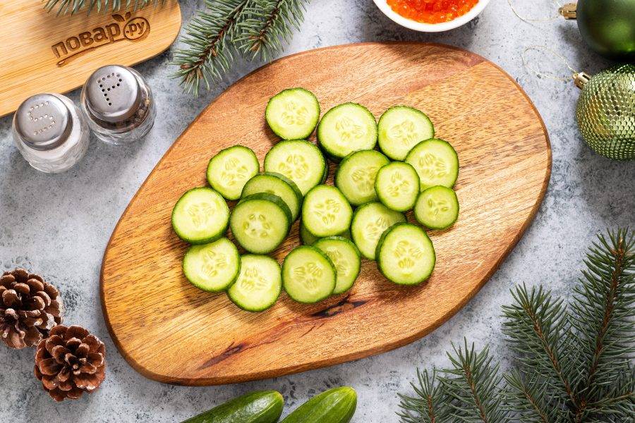 Огурцы нарежьте кружочками толщиной 4-5 мм.