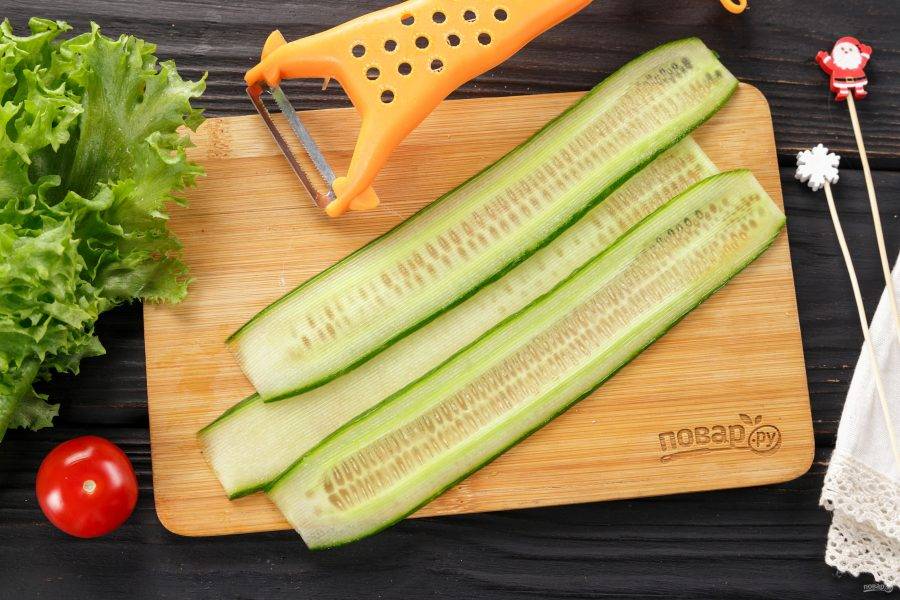 Длинный огурец нужно тонко нарезать вдоль овощечисткой.