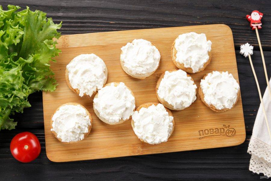 Намажьте тосты творожным сыром.