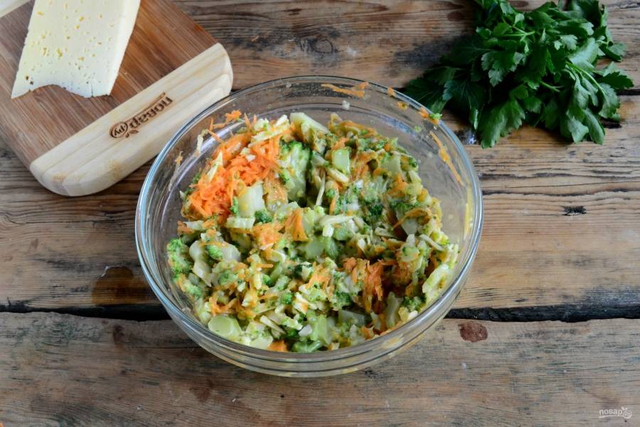 Яйца слегка взбейте венчиком, добавьте брокколи, морковь и сыр. Посолите, всыпьте паприку и выдавите чеснок. Все хорошенько перемешайте.