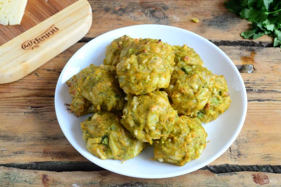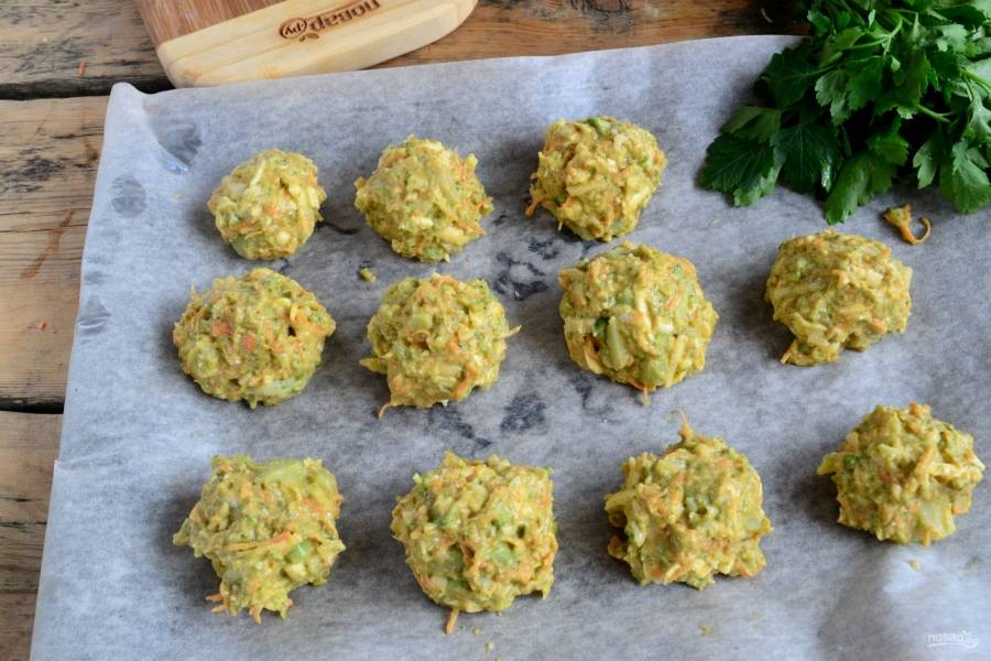 Из полученной овощной массы сформируйте небольшие шарики, выложите их на противень, застеленный пергаментом. Запекайте в духовке 15-20 минут при температуре 180 градусов.