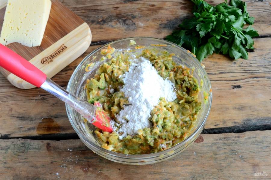 Всыпайте понемногу муку, буквально по 1 ст. ложке. Вымешивайте массу. Если нужно, добавляйте еще муки. Масса должна получиться достаточно густой, чтобы готовая закуска держала форму.
