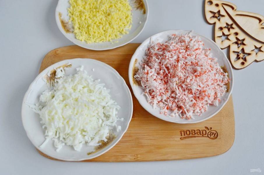 Отварите яйцо, разделите его на белок и желток и натрите на мелкой терке в разные тарелочки. Крабовые палочки лучше заморозить, а потом потереть.