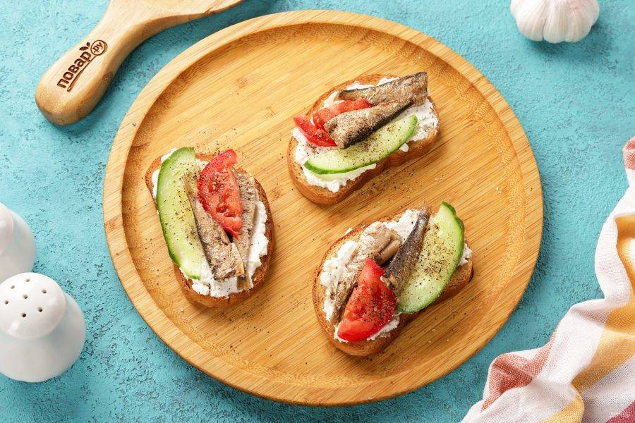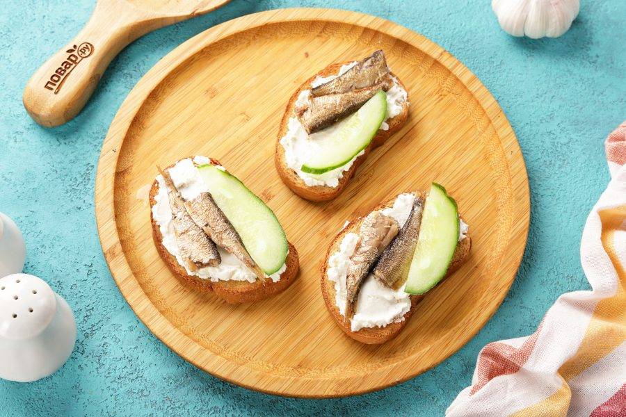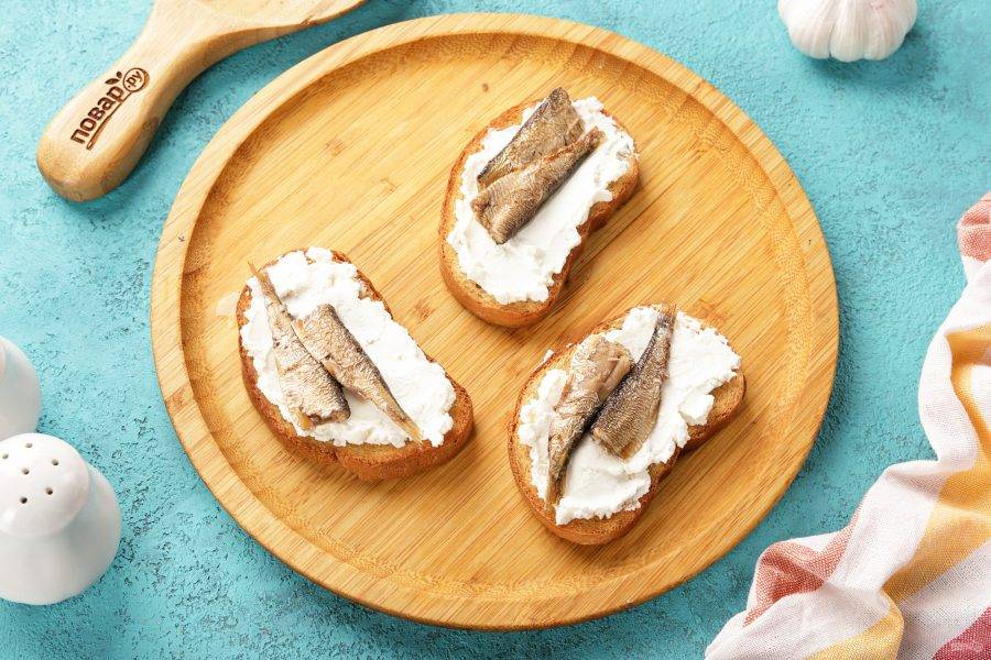 Выложите на каждый тост шпроты из банки, предварительно дав стечь маслу. У меня шпроты небольшие, я выкладывала по две штуки.