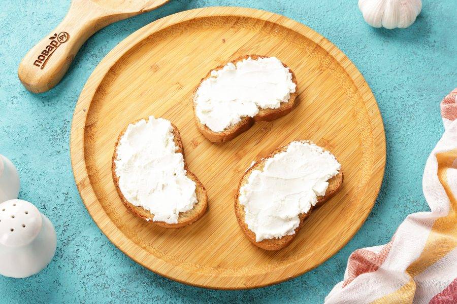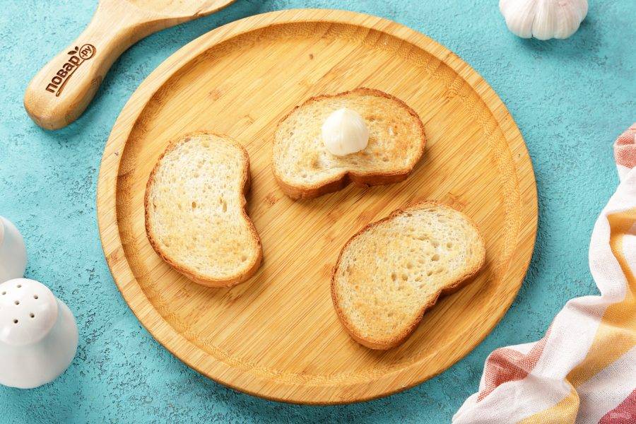 Подсушите хлеб на сухой сковороде или любым другим удобным для вас способом. Натрите хрустящие тосты зубчиком чеснока.