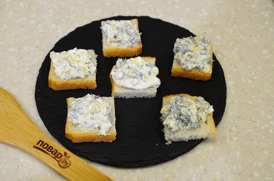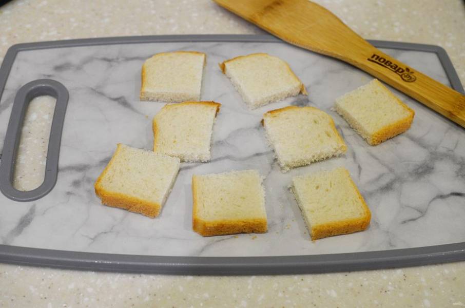 1. Ломтики тостового хлеба разрежьте на 4 части для небольших бутербродов.