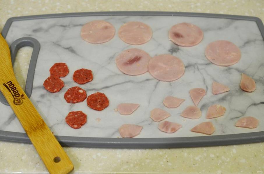 5. Из ветчины вырежьте кружки и ушки для свинок. Из говядины кружки поменьше - для пятачка.