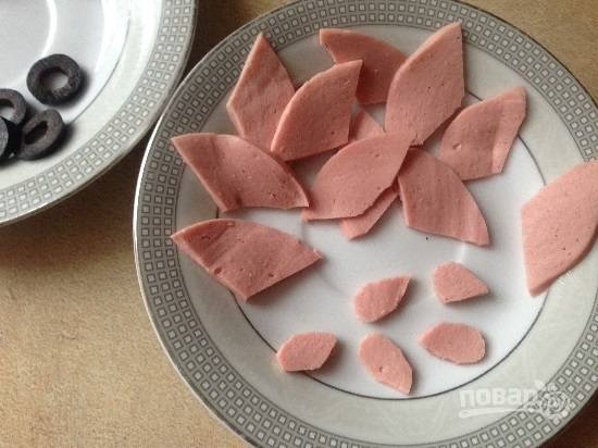 Из ветчины или вареной колбасы нарезаем ушки и язычки.