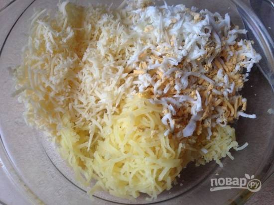 Очистим отваренный в кожуре картофель и сваренные вкрутую яйца. Сыр натираем на средней или мелкой терке.