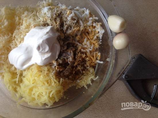 Добавим соль, перец, майонез и измельченный чеснок.