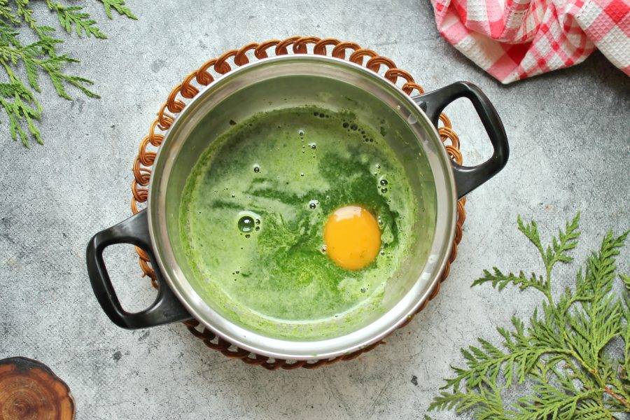 В шпинатную массу разбейте одно яйцо, посолите и половину сахара, перемешайте до однородности.
