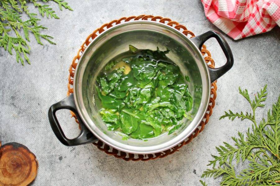 Шпинат порежьте, выложите в кастрюлю с толстым дном и залейте половиной воды. Доведите все до кипения и варите в течение 3 минут на среднем огне. Снимите все с огня, пробейте блендером до однородности и остудите.