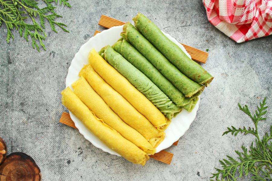 Каждый блинчик сверните в плотный рулетик. Перед подачей порежьте и подавайте на стол.