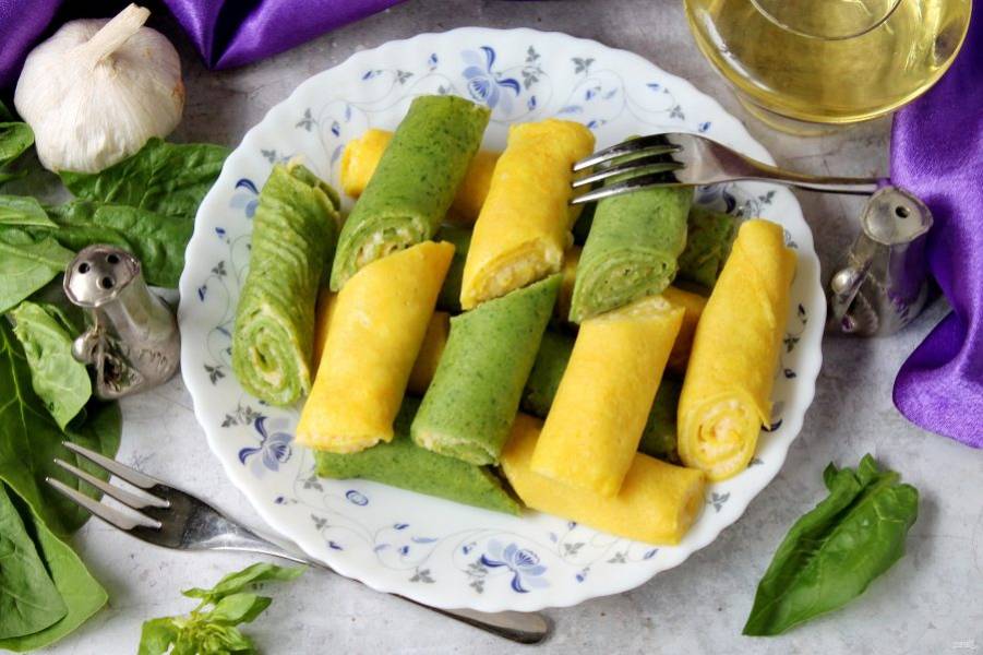 Если любите простые закуски, но с интересным оформлением, приготовьте это блюдо. Цветные блинчики с пикантной начинкой станут настоящей находкой для многих хозяек и украсят любой праздничный стол!