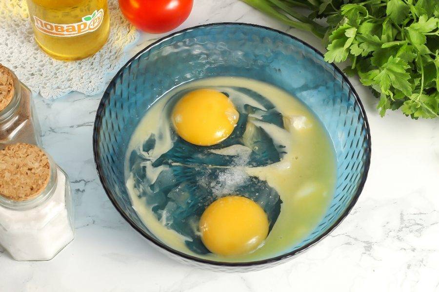 Растопите сливочное масло в глубокой емкости на водяной бане или в микроволновке, но не до кипения. Вбейте в емкость куриные яйца и всыпьте 2 щепотки соли. Тщательно взбейте все венчиком, добавляя молоко любой жирности.