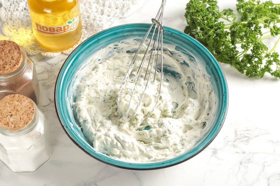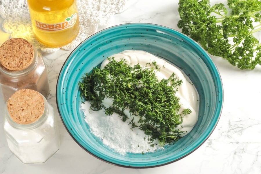 Смешайте жирные сливки с загустителем для сметаны и щепоткой соли. Измельчите промытый укроп и зеленый лук и добавьте в емкость.