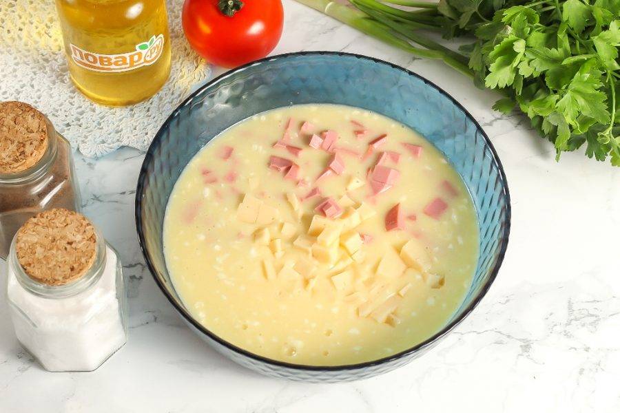 Нарежьте мелкими кубиками вареную колбасу и сыр, добавьте в массу и перемешайте. На терке лучше продукты не измельчать, чтобы тесто лучше поднималось при выпекании.
