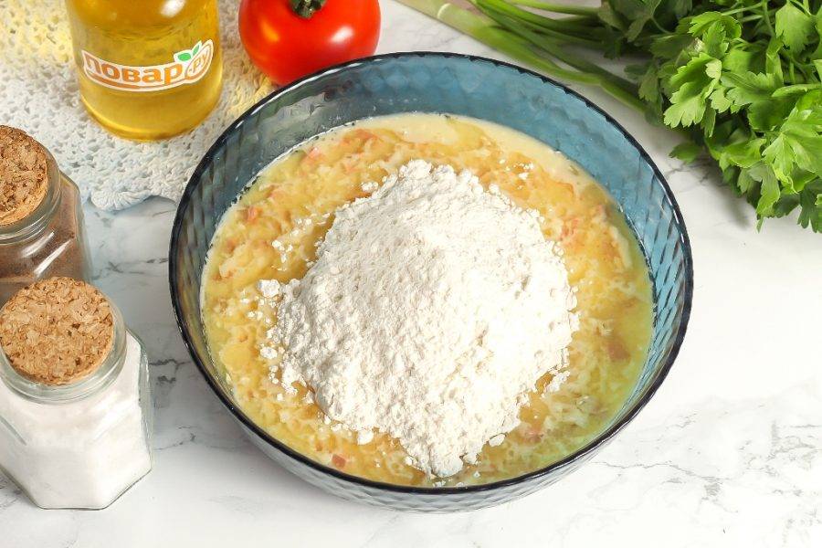 Всыпьте муку и разрыхлитель. Вмешайте их аккуратными движениями. Тесто не должно получиться плотным. По желанию можете всыпать немного овощной приправы или приправы для курицы.